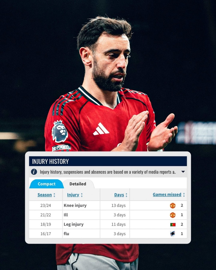 在此之前,B费职业生涯只因伤缺战4场比赛,俱乐部生涯仅在2024年5月因膝伤错过2场比赛。此外,他曾因生病分别在桑普和曼联缺战过一场比赛。此次因伤休战一个月,在对B费个人来说尚属头一遭。