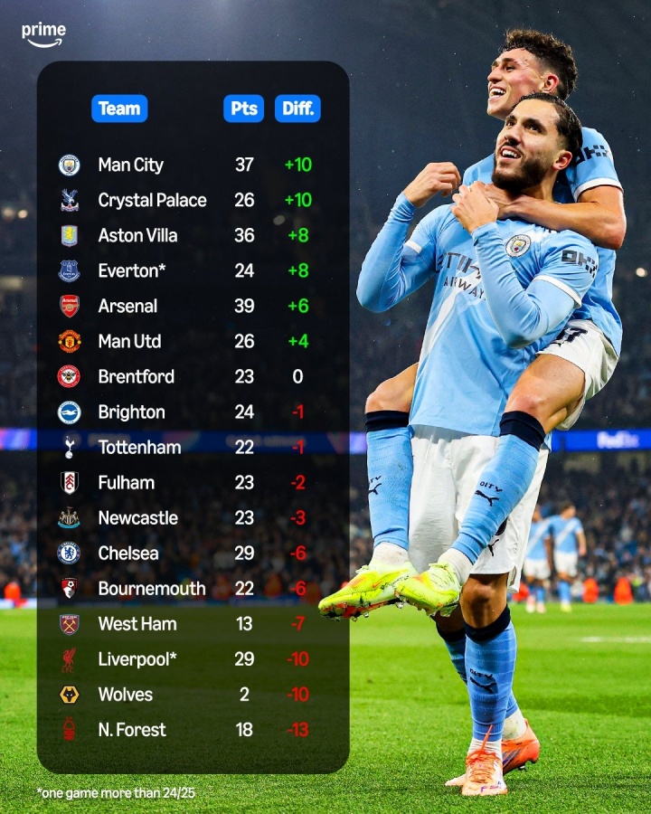曼城、水晶宫相较上赛季同期多拿了10个积分,是进步最大的两支球队。而维拉、埃弗顿则多拿了8分,阿森纳、曼联分别多拿6分和4分。