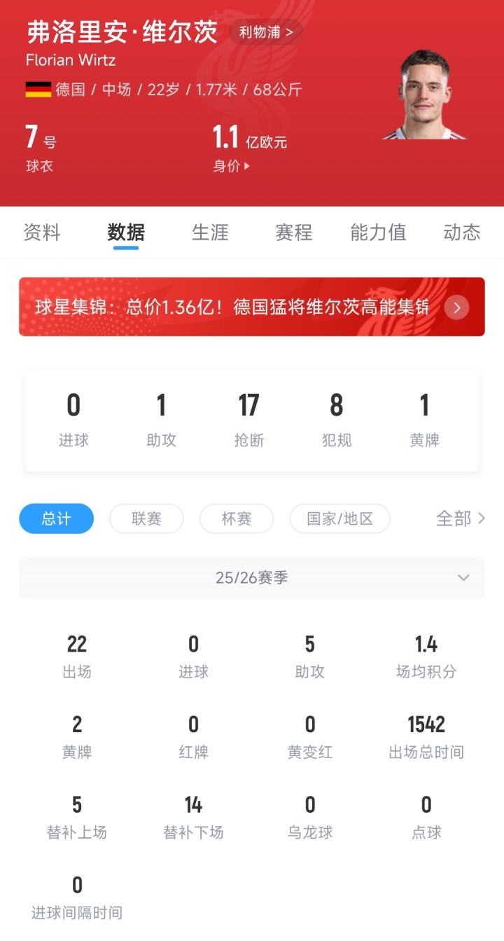 今年夏窗维尔茨以1.25亿欧元的转会费加盟利物浦,至今代表球队出战23场比赛,贡献1球5助,其中英超17场1球1助。目前维尔茨的德转身价为1.1亿欧元。