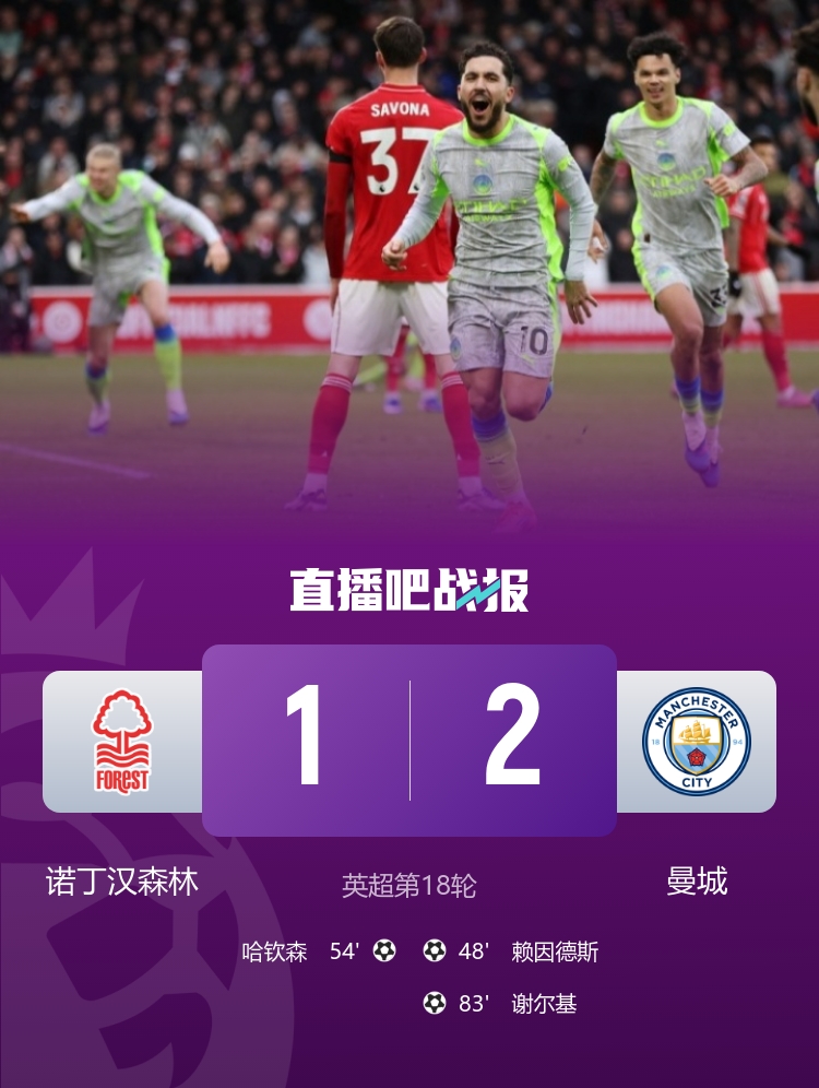 北京时间20:30,英超第18轮诺丁汉森林vs曼城,比赛在诺丁汉城市足球场打响!上半场,曼城控球率近7成,但双方均0射正;迪亚斯吃到黄牌。下半场,赖因德斯先是低射打破僵局,随后前场失误晃倒自己,森林流畅反击,哈钦森扳平比分;谢尔基精彩抽射破门,本场比赛传射建功!最终,曼城2-1战胜诺丁汉森林,各项赛事取得8连胜!