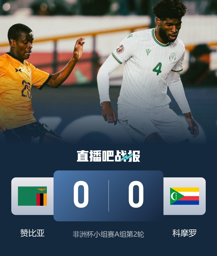 直播吧12月27日讯 北京时间1:30,非洲杯小组赛A组第2轮赞比亚vs科摩罗。上半场,毛利达打进一球,但因队友犯规被判无效!下半场,双方均无建树。最终,赞比亚0-0战平科摩罗,两队均2场不胜。
