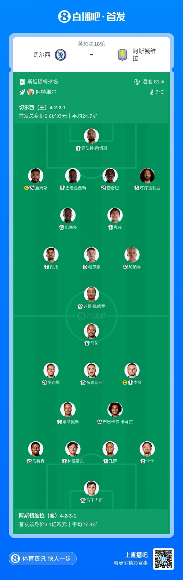 切尔西首发:1-罗伯特·桑切斯、24-里斯·詹姆斯、23-查洛巴、5-巴迪亚西勒、3-库库雷利亚、25-凯塞多、8-恩佐、7-内托、10-帕尔默、49-加纳乔、20-若昂·佩德罗