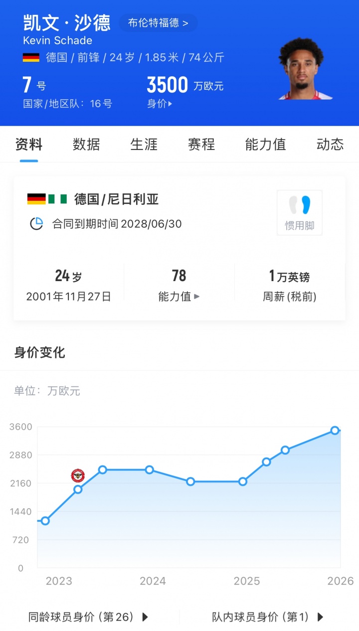 沙德现年24岁,身高1.85米,他2023年从弗赖堡转会布伦特福德,本赛季他为小蜜蜂出战17场英超,贡献6球1助,目前德转身价3500万欧。
