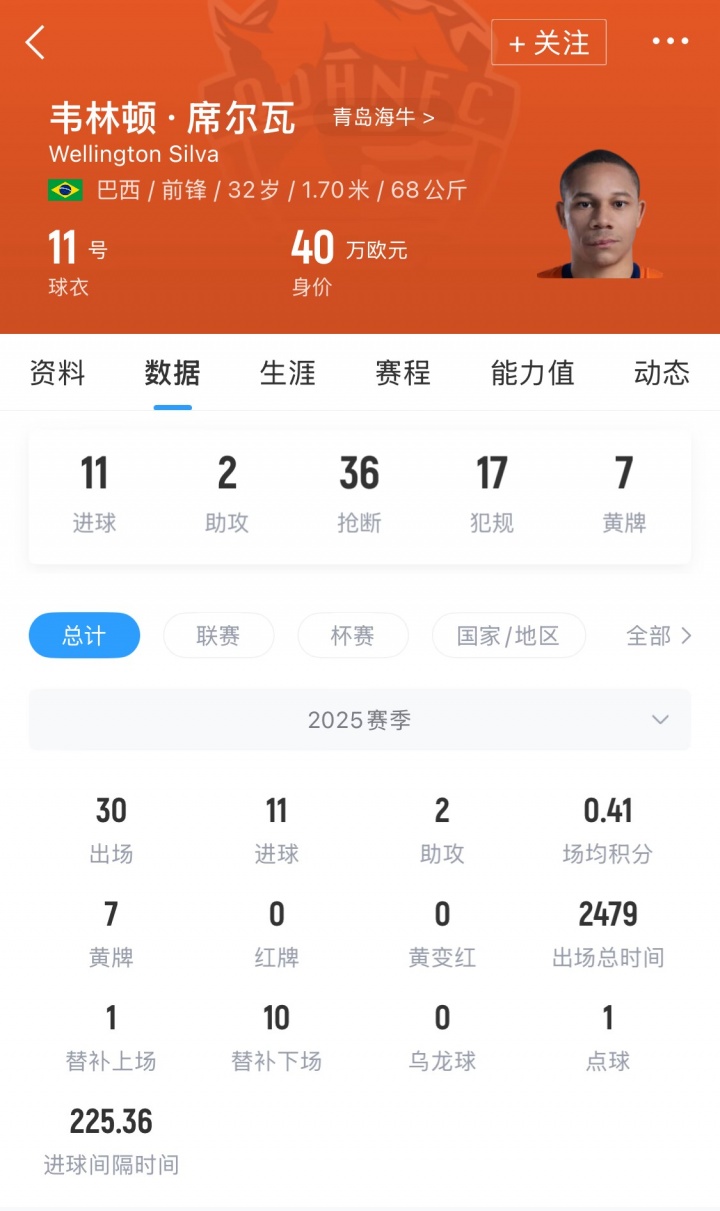 韦林顿·席尔瓦现年32岁,2025赛季他代表青岛海牛出战30场,贡献11个进球和2次助攻。