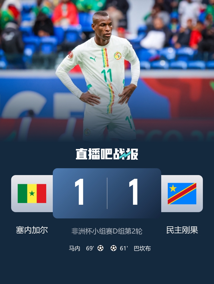 直播吧12月28日讯 北京时间12月27日23点,非洲杯小组赛D组第2轮,塞内加尔对阵民主刚果。上半场,万比萨卡进球被吹,杰克逊两度错失良机。下半场,巴坎布补射破门,马内同样是补射扳平比分。最终塞内加尔1-1民主刚果。
