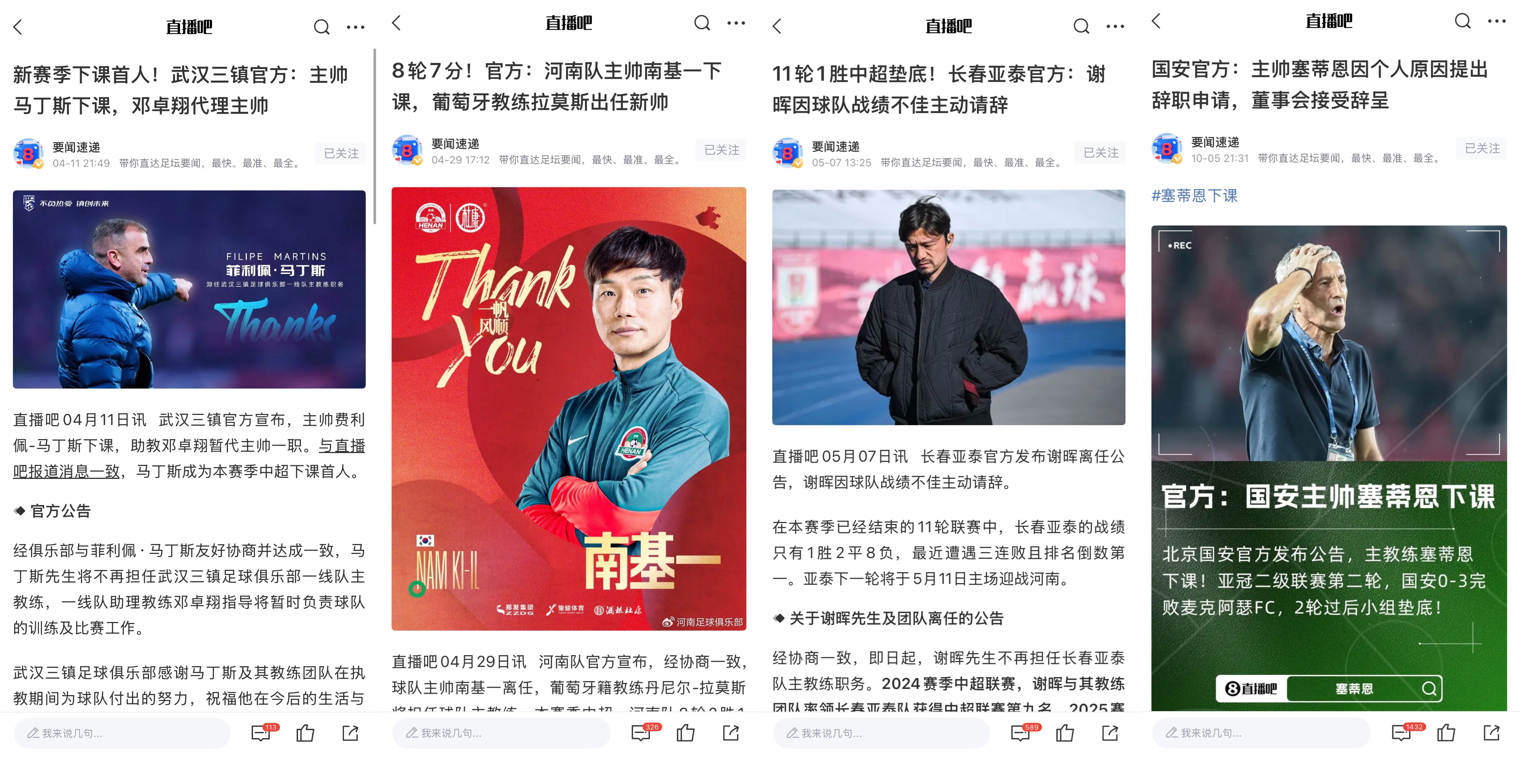 4月9日,@直播吧足球获悉,三镇主帅马丁斯下课,成为新赛季中超下课首人。两天后,三镇官宣马丁斯下课。