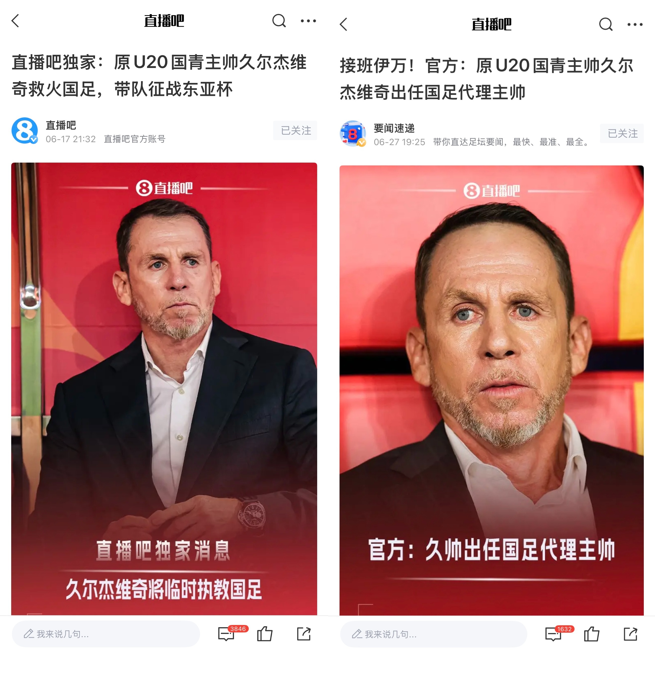 十天之后,中国足协发布官方公告,正式宣布伊万不再担任国足主教练,并官宣久尔杰维奇出任代理主帅,临时带队参加东亚杯,直播吧的报道得到验证。