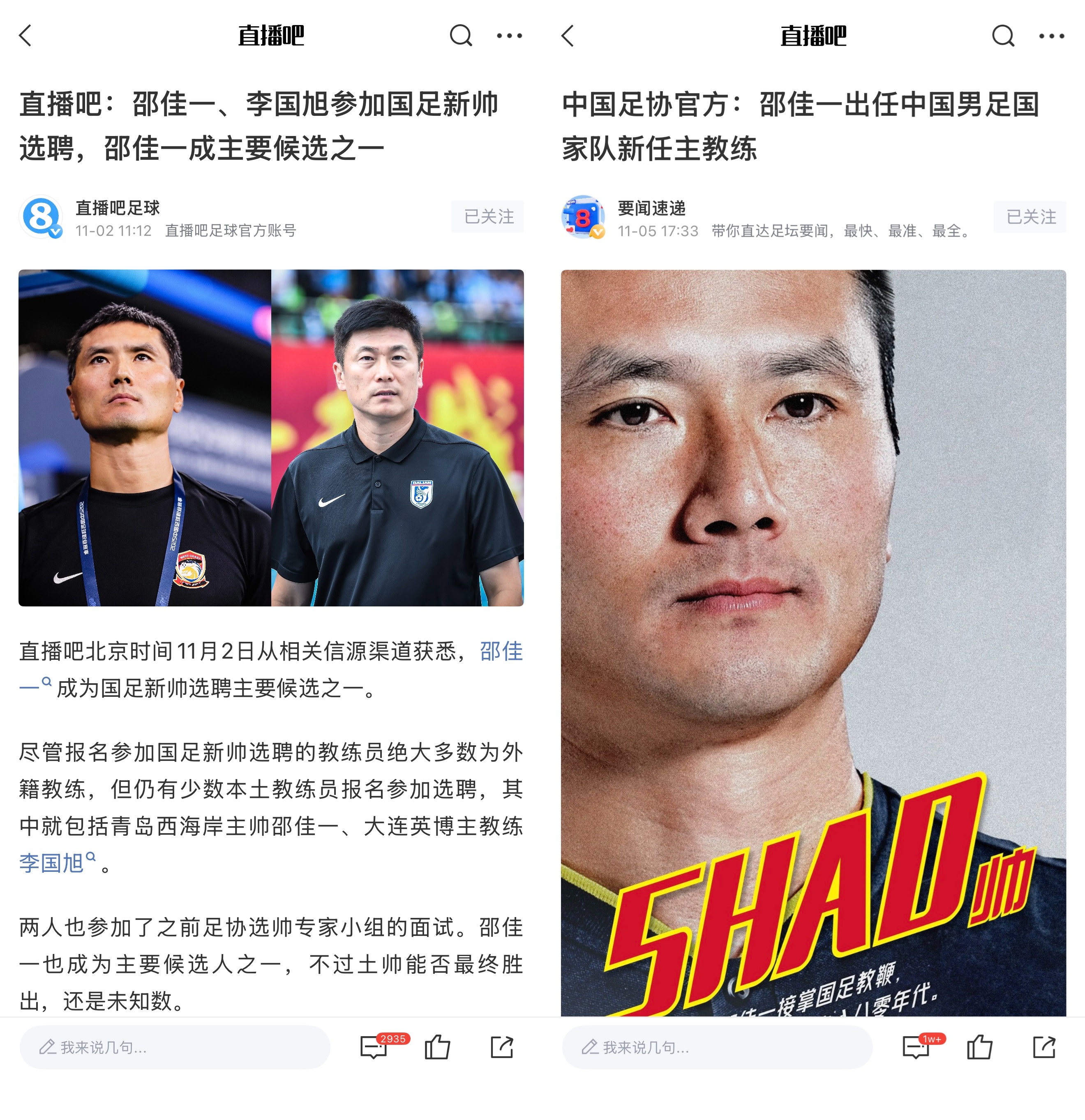 11月5日,中国足协正式官宣,邵佳一出任中国国家男子足球队主教练。