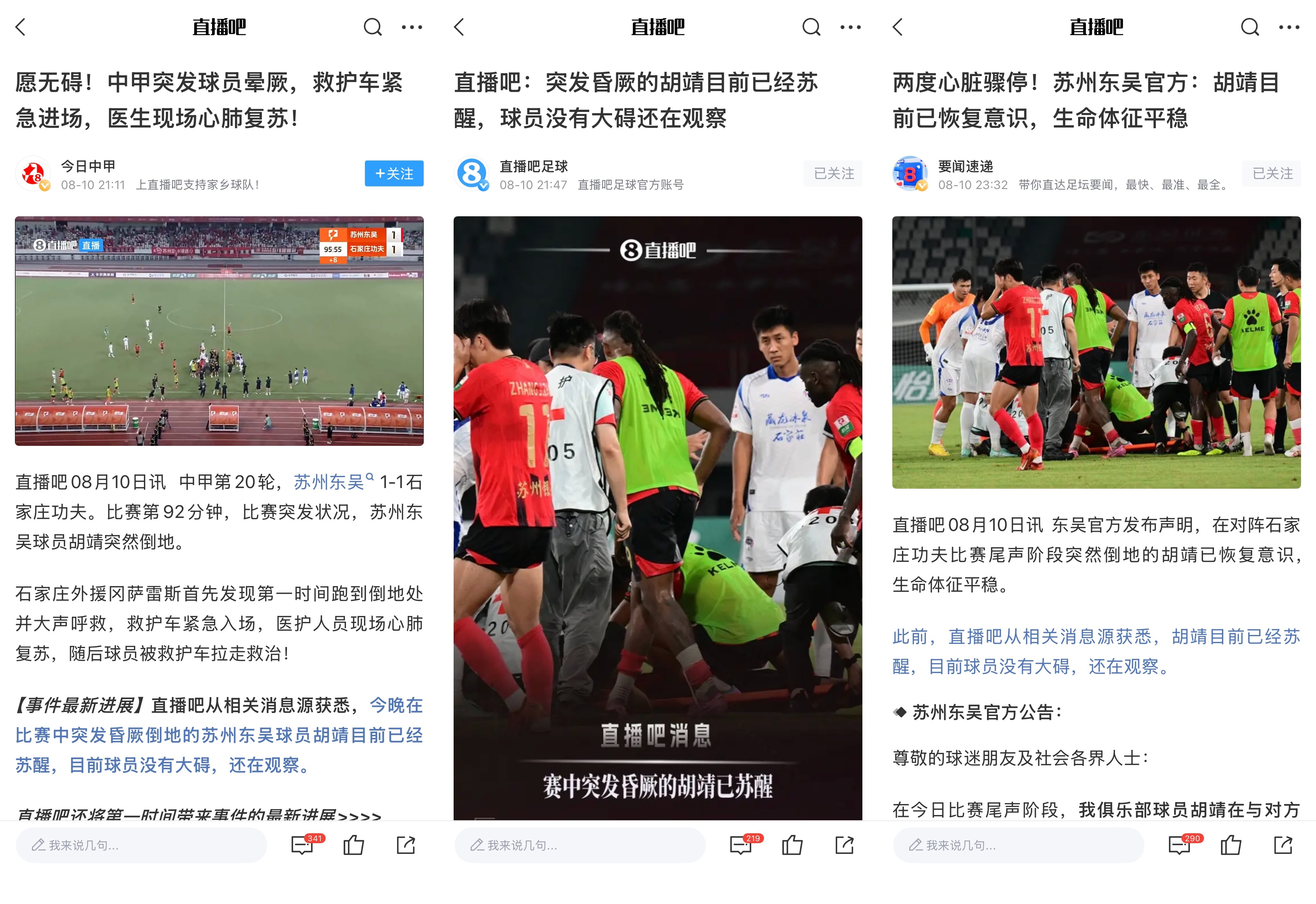8月10日的一场中甲比赛,因为苏州东吴球员胡靖的突然倒地而牵动着千万球迷的心。对手外援首先发现胡靖的异状,小跑上前大声呼救,随后医护人员紧急上前进行心肺复苏,救护车将胡靖送往医院。