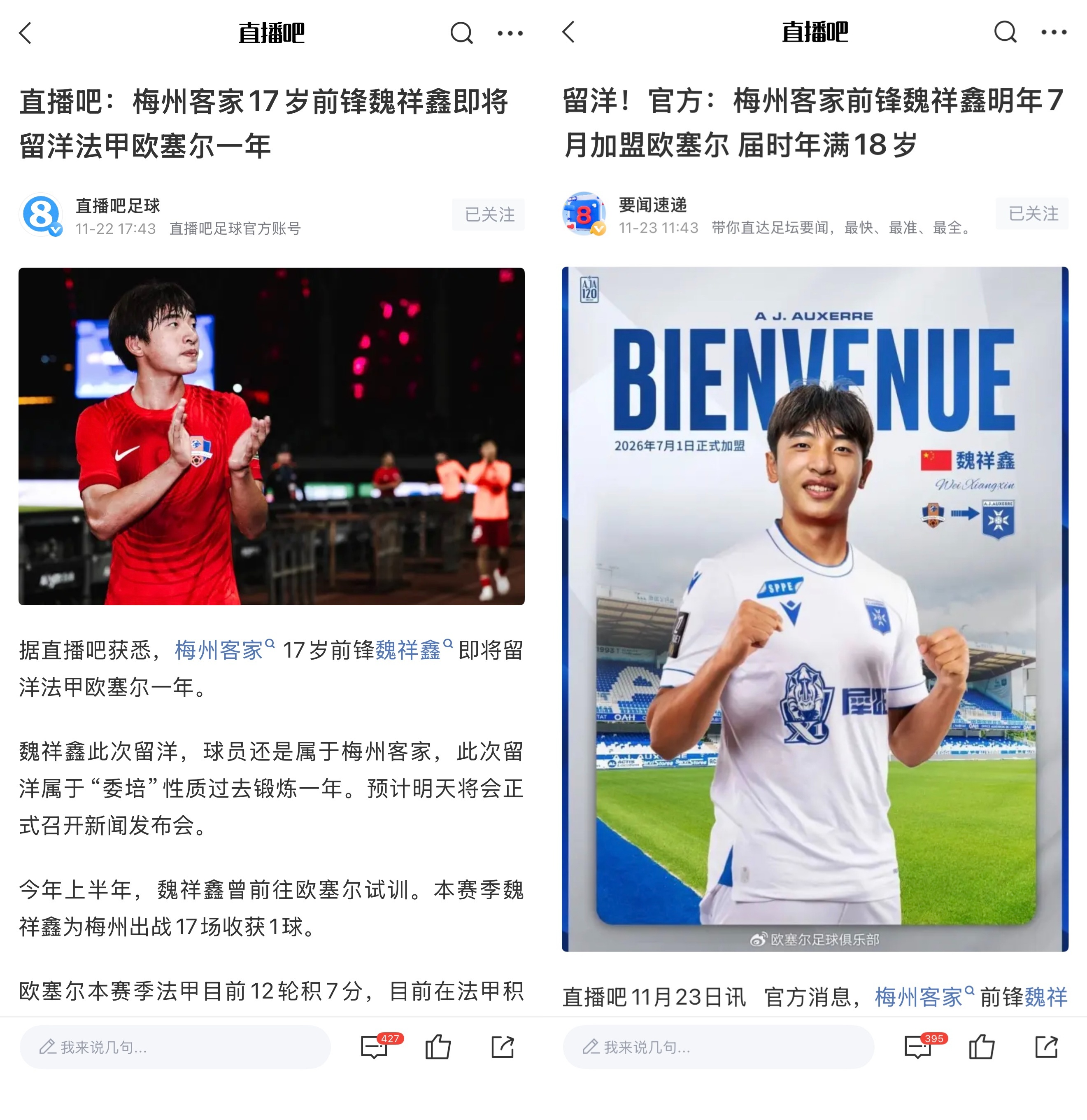 11月21日,网传17岁梅州客家前锋魏祥鑫即将开启留洋生涯,11月22日,@直播吧足球 确认了这一消息:魏祥鑫将以“委培”性质加盟法甲欧塞尔一年。