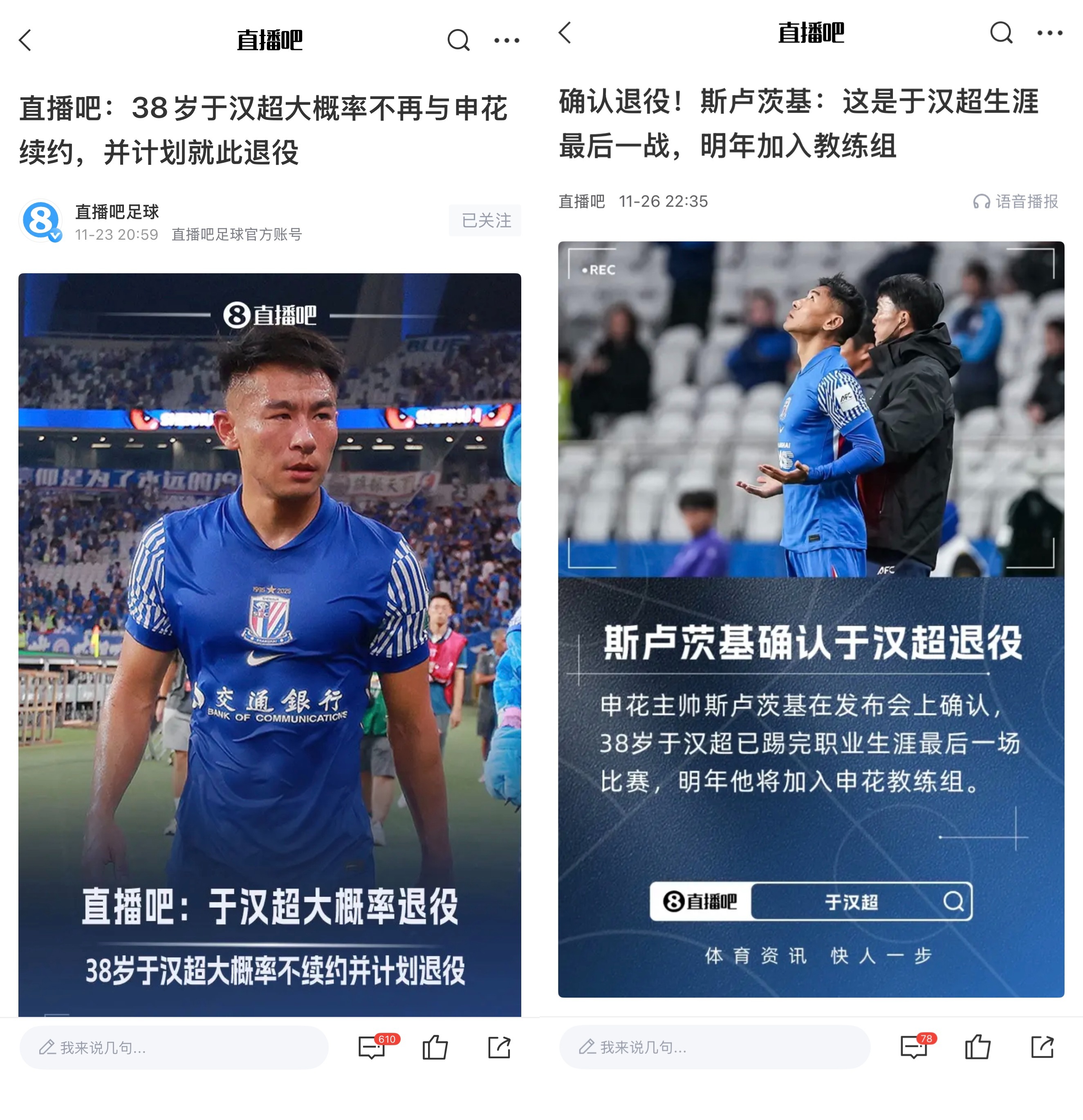 11月23日,@直播吧足球披露:于汉超大概率不再与上海申花俱乐部续约,并计划就此退役。