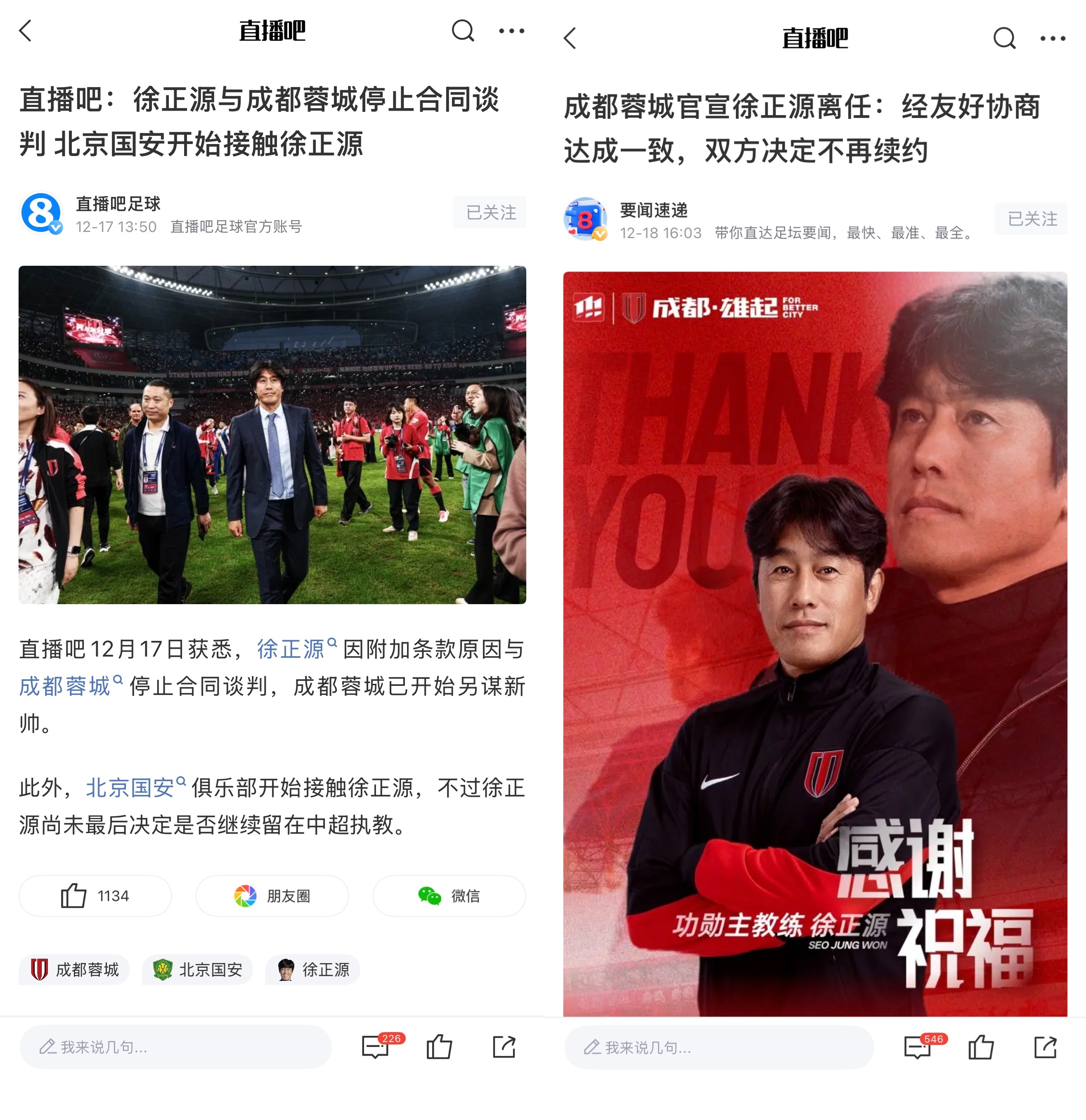 本赛季中超联赛结束后,12月17日,@直播吧足球 获悉,徐正源因附加条款原因与成都蓉城停止合同谈判,成都蓉城已开始另谋新帅。次日,成都蓉城俱乐部官宣徐正源离任,授予其成都蓉城足球俱乐部“功勋主教练”称号。