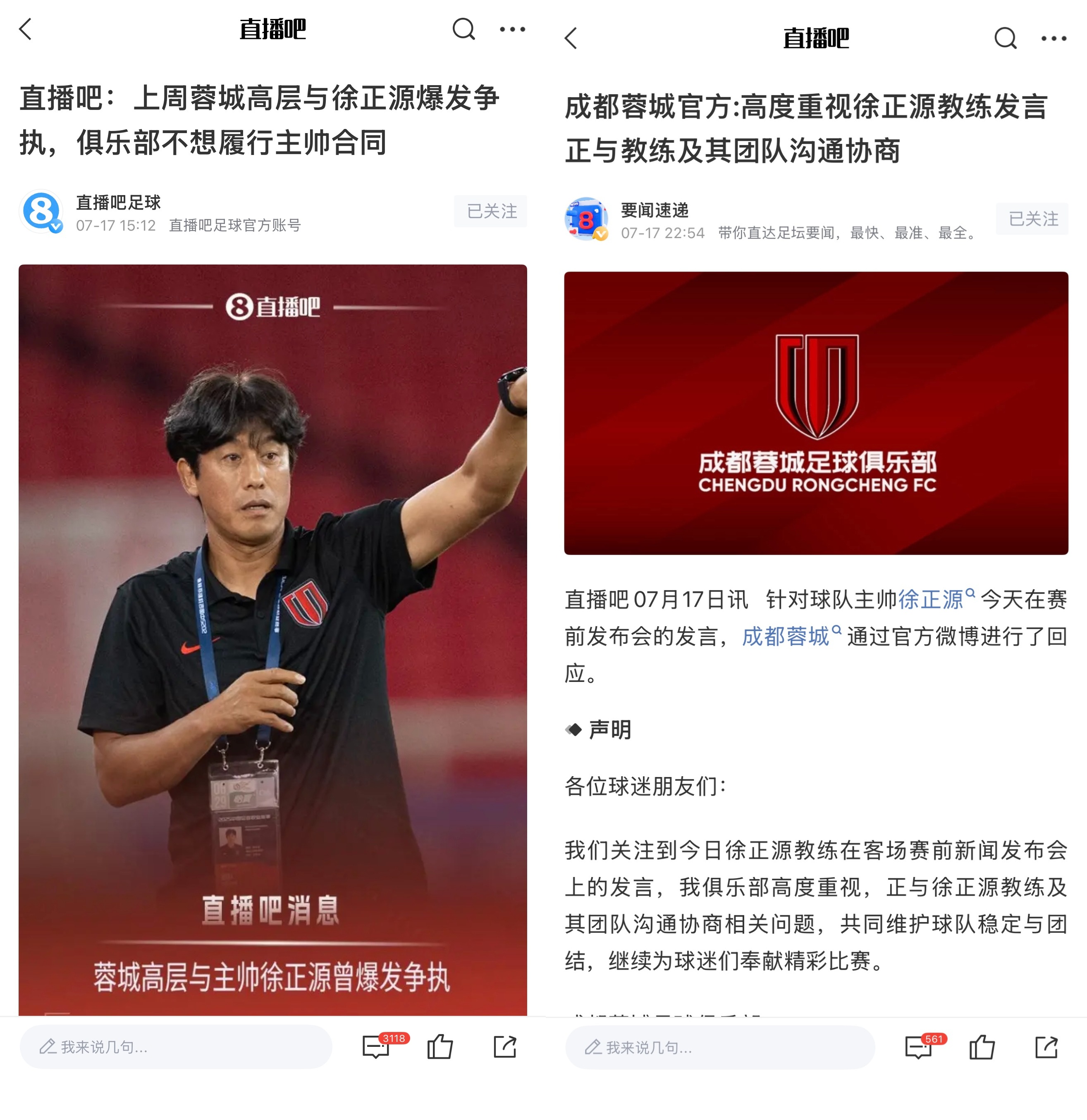7月份,成都蓉城主帅徐正源的妻子在社媒上公开表示对俱乐部的不满。7月17日,@直播吧足球 获悉,蓉城高层在上一周与徐正源发生了争执,半年多以来蓉城一直不想履行与徐正源之间的合同以及自动续约的合同条款。