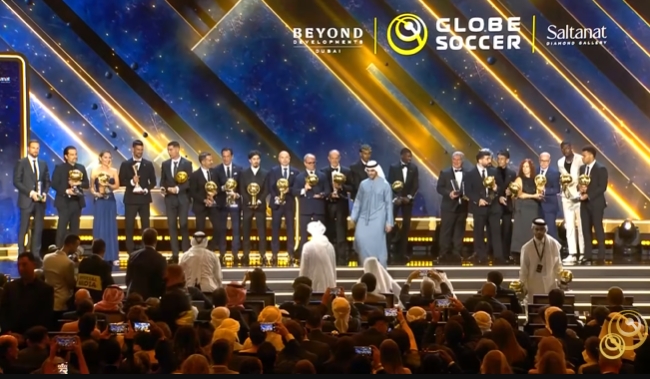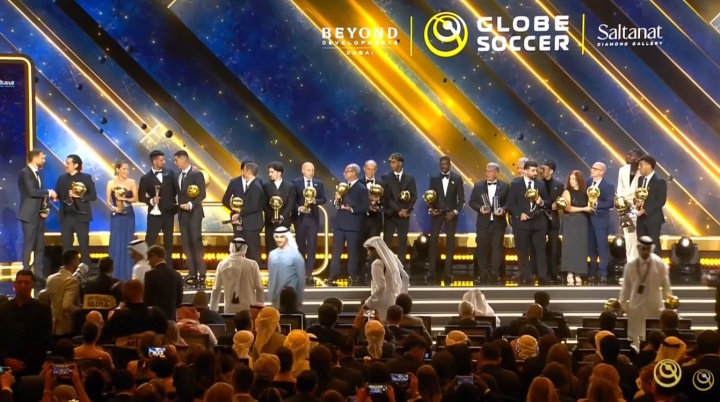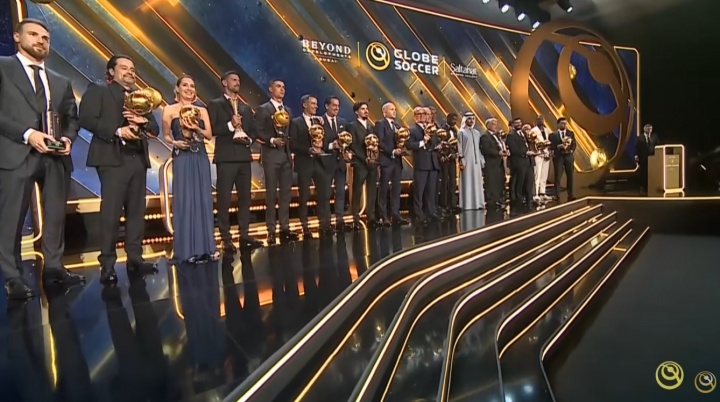 直播吧12月29日讯 2025年环球奖颁奖典礼结束,在颁奖典礼最后的大合影上,几乎人手一个奖杯。