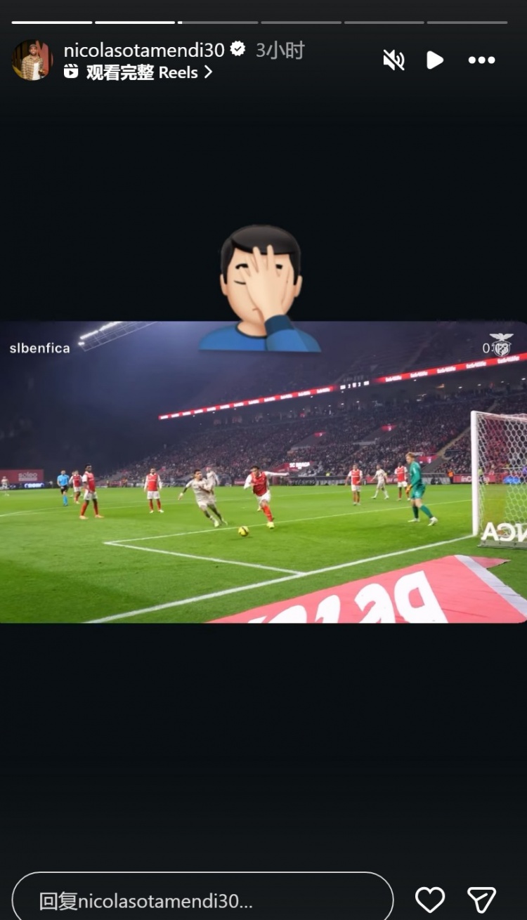 本菲卡后卫奥塔门迪社媒晒出这粒进球的视频,并配上捂脸的表情符号,吐槽裁判的判罚。