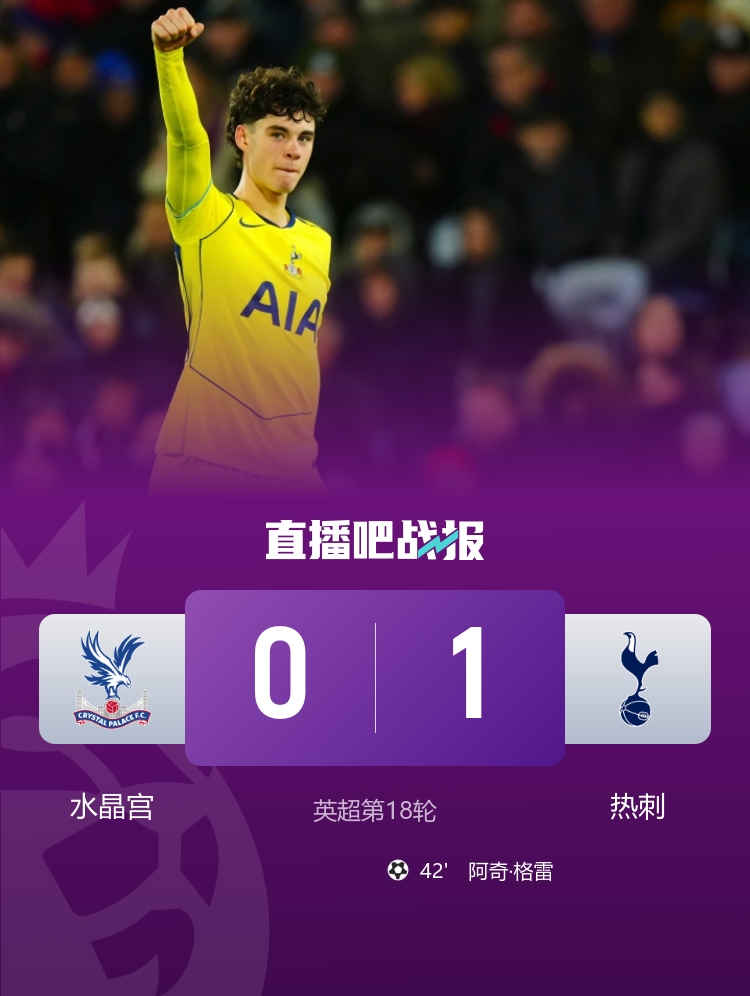 直播吧12月29日讯 北京时间12月29日0点30分,英超第18轮,水晶宫在主场塞尔赫斯特公园球场迎战热刺。上半场,里沙利松进球被吹,格雷头球破门。下半场,德文尼错失良机,里沙利松破门再度被吹,奥多贝尔射中立柱。最终热刺1-0击败水晶宫。本场比赛过后,热刺积25分,排在第十一名,水晶宫积26分,排在第九名。