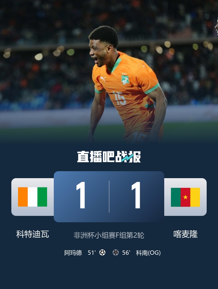 直播吧12月29日讯 北京时间12月29日凌晨4:00,非洲杯小组赛F组第2轮,科特迪瓦在马拉喀什综合体育场对阵喀麦隆。上半场阿玛德中柱,科法内中横梁,科特迪瓦暂0-0喀麦隆;下半场凯西进球因越位在先无效,阿玛德破门,科南乌龙球,最终科特迪瓦1-1喀麦隆,两队握手言和,同积4分,分列小组前二。