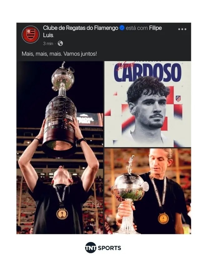 直播吧12月30日讯 《马卡报》报道,弗拉门戈在官宣主教练费利佩·路易斯续约的消息时闹了乌龙,加上了马竞中场约翰尼·卡尔多索的照片,引发球迷猜想。