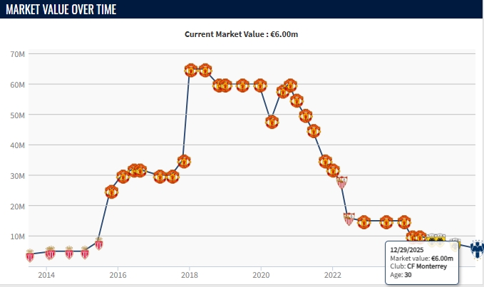 今年9月马夏尔从希腊球队雅典AEK转会至蒙特雷,转会费100万欧。在过去的4个月时间里,马夏尔仅代表蒙特雷出战12场,2次首发,没有进球和助攻。