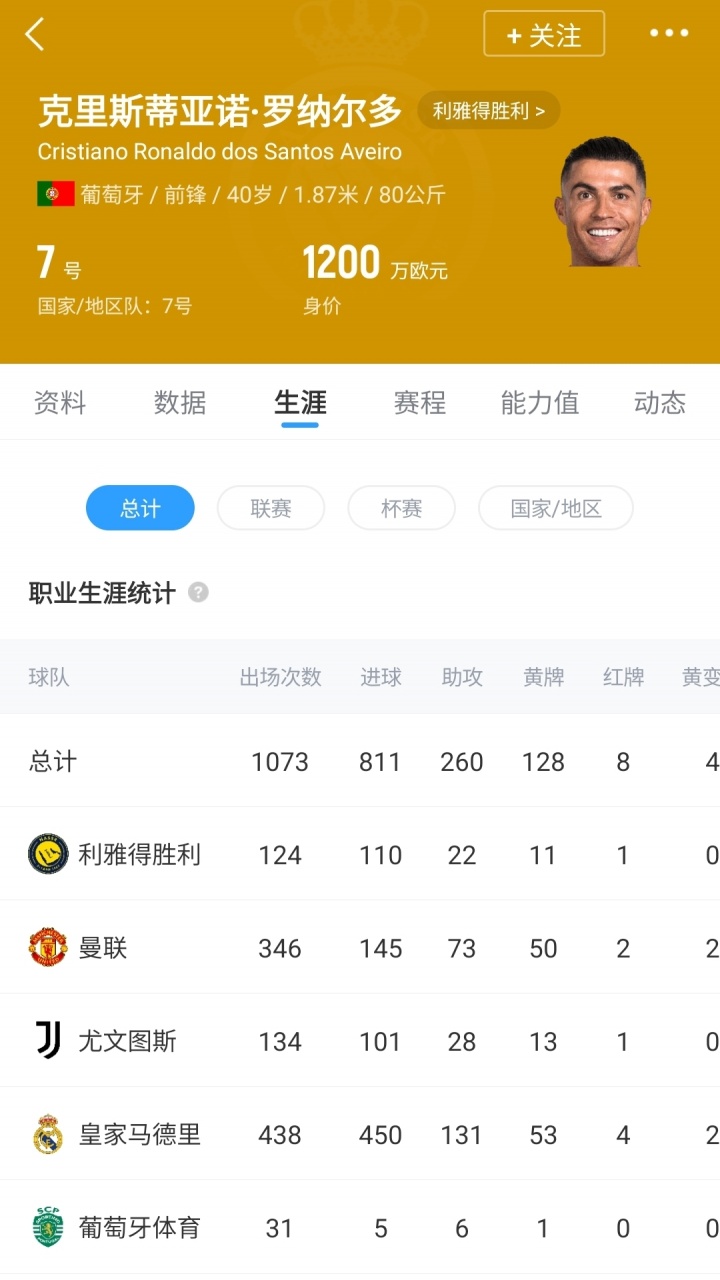 效力球队3年来,C罗共出战124场比赛,贡献110球22助。
