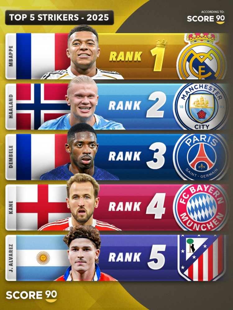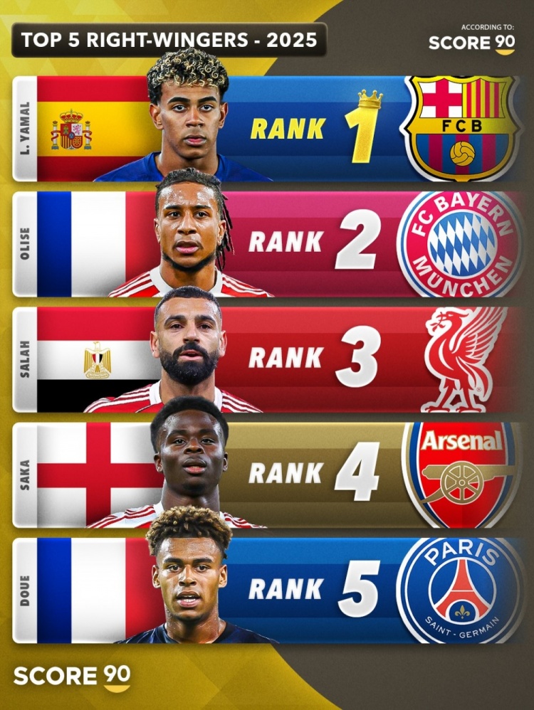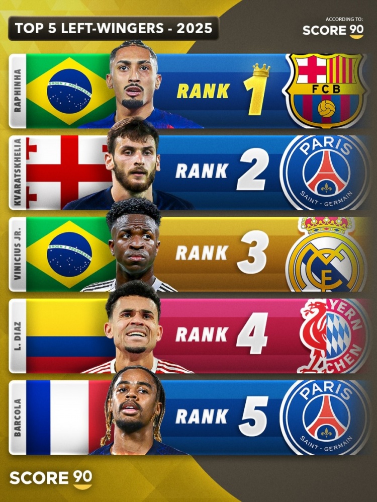 直播吧12月31日讯 2025年世界足坛精彩纷呈,但也即将拉下帷幕。Score90媒体评选出各个位置的前5最佳球员,其中包括最佳中场、最佳进攻型中场、最佳防守型中场、最佳左边锋、最佳右边锋、最佳前锋、最佳左后卫、最佳右后卫、最佳中后卫、最佳门将。
