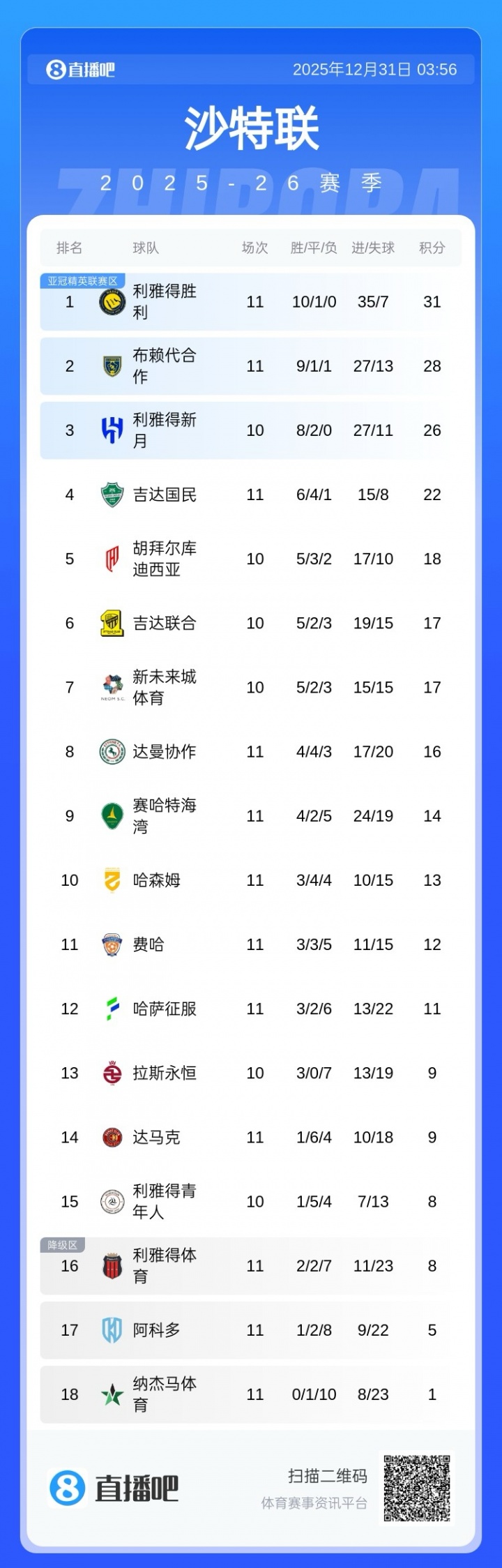 目前,利雅得胜利10胜1平仍以不败战绩领跑沙特联积分榜。