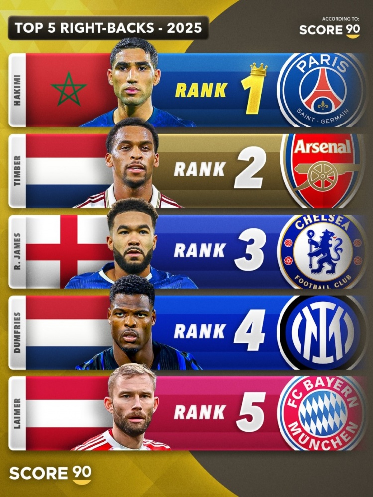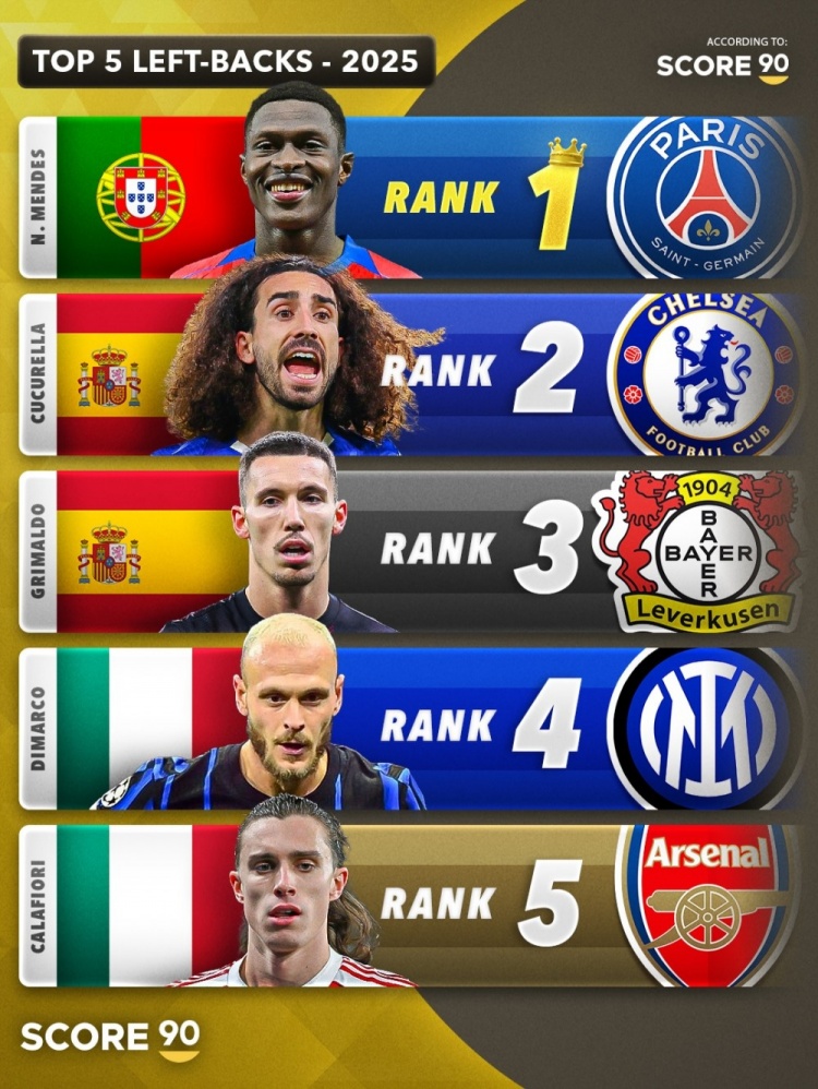 直播吧12月31日讯 2025年世界足坛精彩纷呈,但也即将拉下帷幕。Score90媒体评选出各个位置的前5最佳球员,其中包括最佳中场、最佳进攻型中场、最佳防守型中场、最佳左边锋、最佳右边锋、最佳前锋、最佳左后卫、最佳右后卫、最佳中后卫、最佳门将。