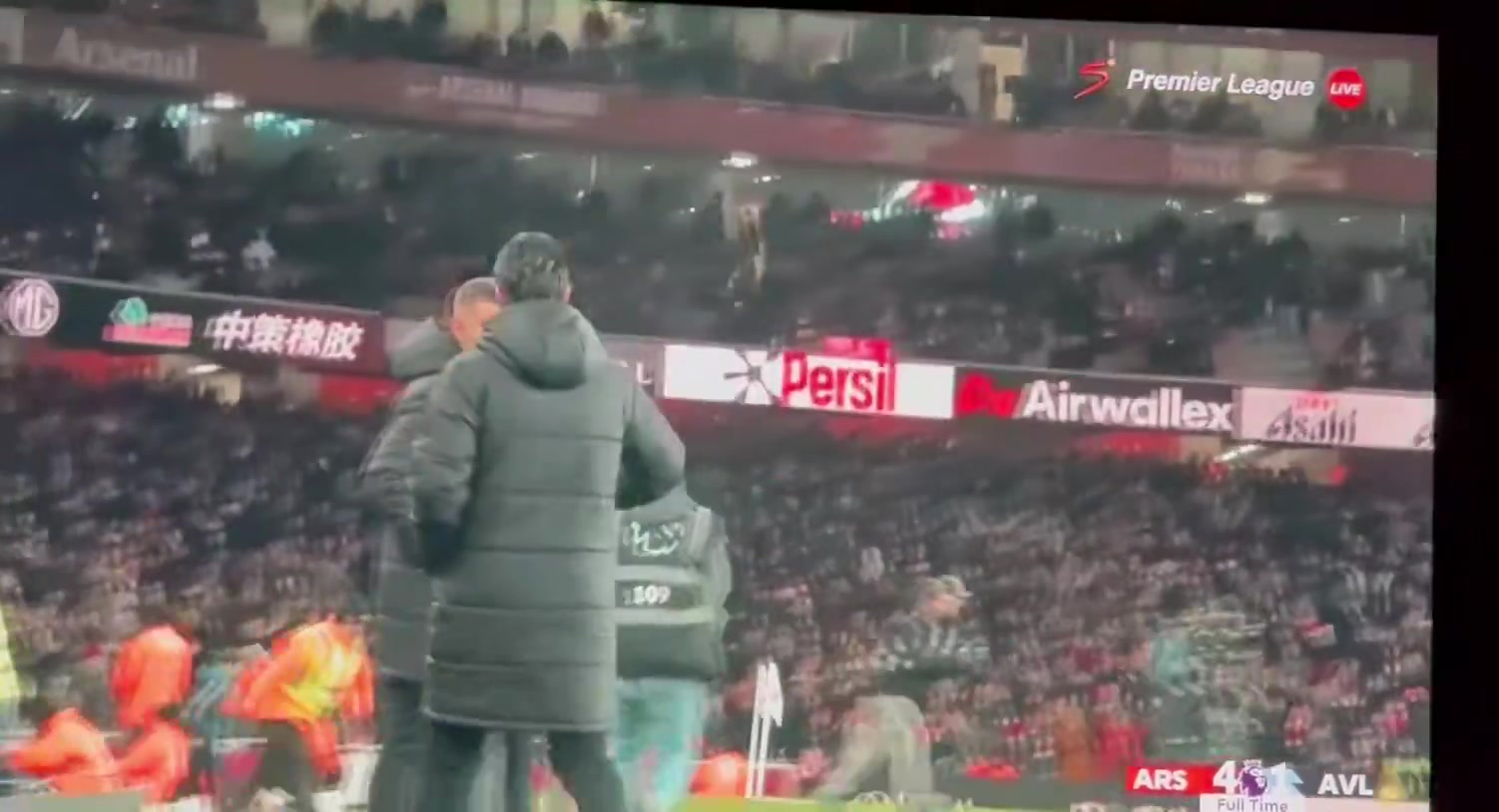 从另一个转播视角可以看到终场哨响时埃梅里的反应,可以看到他在比赛结束后,没有停留直接就走回了球员通道,而阿尔特塔在与教练组拥抱后想找埃梅里握手,已经找不到人。