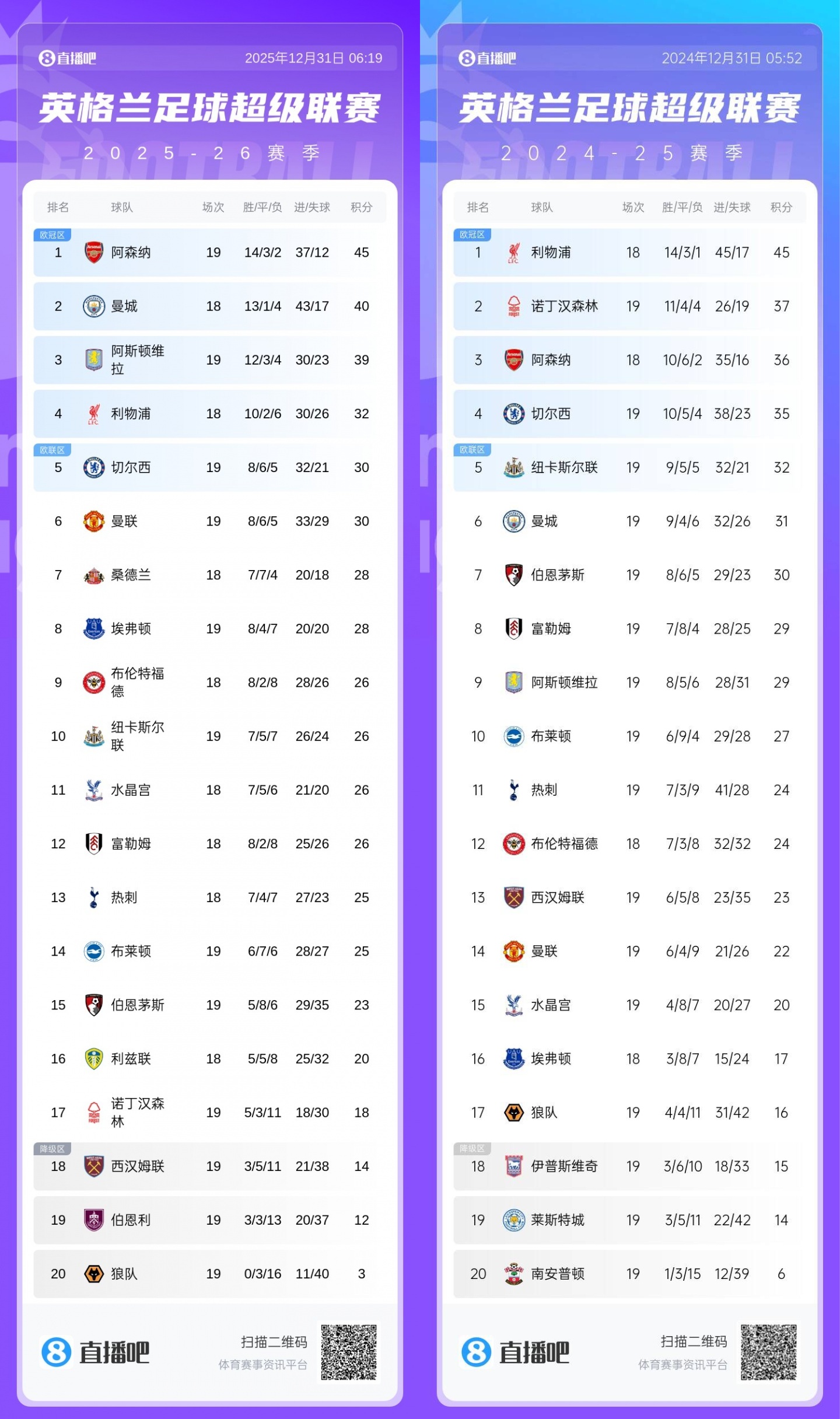 2024和2025年的12月31日积分榜对比,其中曼城目前少赛一场,阿森纳多赛一场