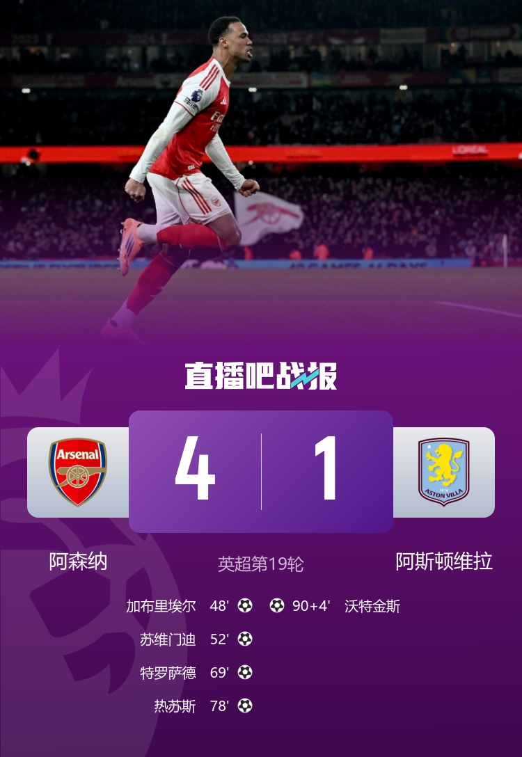 直播吧12月31日讯 英超第19轮,阿森纳坐镇主场酋长球场迎战阿斯顿维拉。上半场,沃特金斯错失良机。易边再战,加布里埃尔、苏维门迪、特罗萨德、热苏斯连进四球,拉亚补时神扑,沃特金斯扳回一城。最终阿森纳4-1维拉。积分榜方面,阿森纳45分暂5分领跑,维拉各赛事11连胜终结39分第三。
