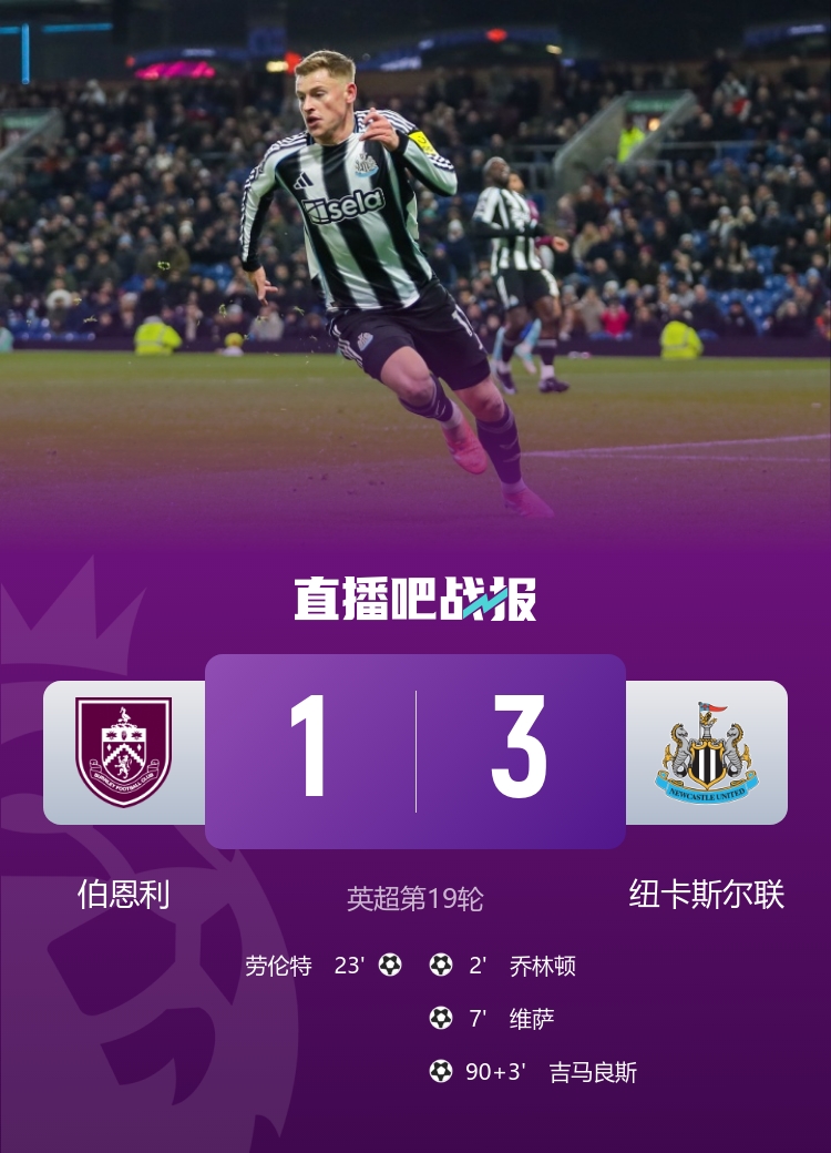 直播吧12月31日讯 英超第19轮,伯恩利坐镇主场特夫摩尔球场迎战纽卡斯尔联。上半场,乔林顿、维萨连入两球,劳伦特扳回一城,沙尔门线解围。易边再战,汉弗莱斯也是门线解围,吉马良斯补时锁定胜局。最终伯恩利1-3纽卡。积分榜方面,纽卡26分暂升第九,伯恩利12分倒二。