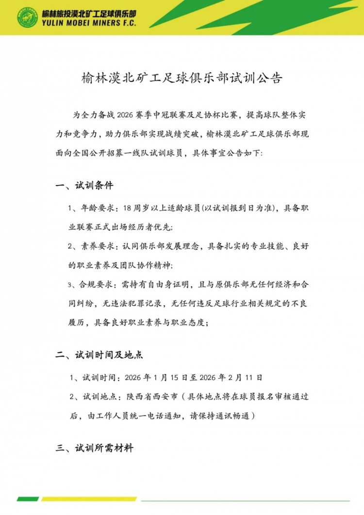 >榆林漠北矿工足球俱乐部2026赛季试训公告