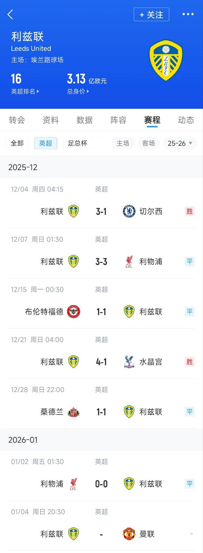作为保级队,白玫瑰利兹联近6轮英超取得2胜4平拿到10分,战绩非常亮眼。更重要的是,他们的对手含金量十足:切尔西(胜)、利物浦(2平)、布伦特福德(平)、水晶宫(胜)、桑德兰(平)。