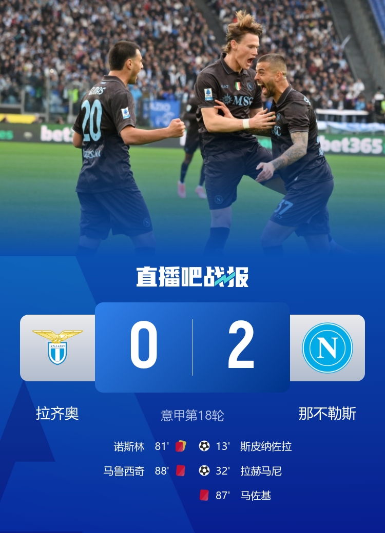 直播吧1月4日讯 北京时间1月4日19:30,意甲第18轮,那不勒斯做客罗马奥林匹克球场挑战拉齐奥。上半场,那不勒斯占优,波利塔诺助攻斯皮纳佐拉、拉赫马尼破门,埃尔马斯中框;下半场,诺斯林两黄一红被罚下,马佐基和马鲁西奇爆发冲突各染一红。最终,那不勒斯2-0战胜拉齐奥,积37分升至第二,落后榜首1分,拉齐奥积24分位列第9位。