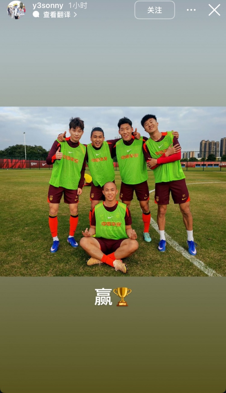 今日入选国足训练名单的泰山后卫刘洋更新社媒,晒出与张玉宁、黄政宇等的合影,并配文写道:“赢🏆”。