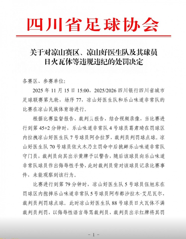 最终,四川省足协依据相关规定,对日火瓦体做出了禁止参加四川省各级体育部门及足协举办的足球赛事活动5年的处罚。