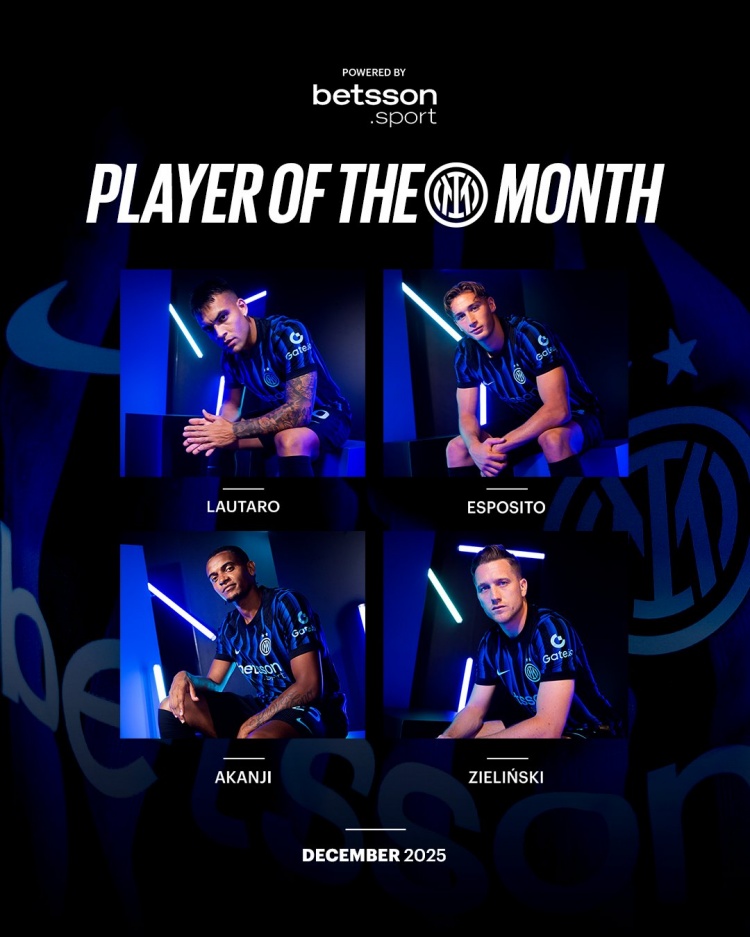 直播吧1月5日讯 国米官方公布2025年12月队内最佳球员4人候选名单,劳塔罗、皮奥·埃斯波西托、阿坎吉以及泽林斯基入围。