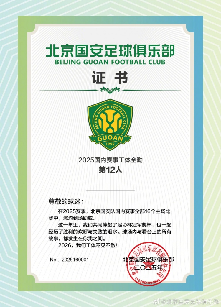 请各位全勤球迷持本人2025赛季年卡或身份证作为身份凭证,前往活动现场领取证书。