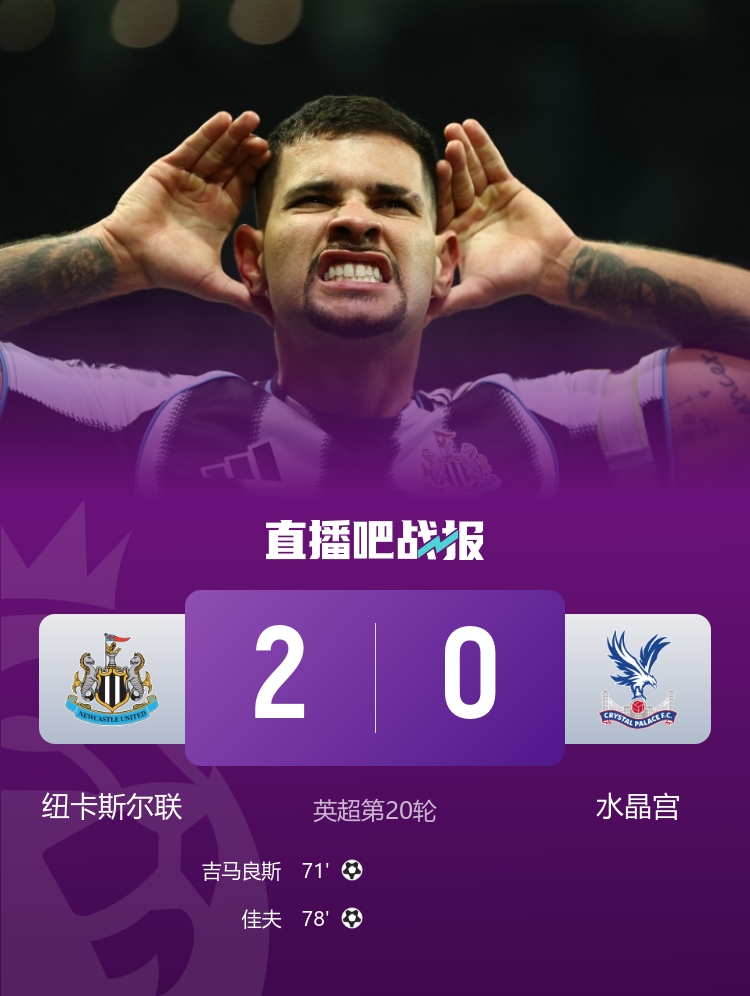 直播吧1月5日讯 北京时间1月4日晚23时整,2025-26赛季英超第20轮在圣詹姆斯公园球场展开角逐,纽卡斯尔联主场迎战水晶宫。上半场戈登进球越位无效,休斯失良机,下半场吉马良斯打破僵局+角球中框,佳夫扩大比分。最终纽卡斯尔联主场2-0战胜水晶宫,纽卡联赛两连胜+积29分升至第9,水晶宫近5轮1平4负+积27分名列第14。