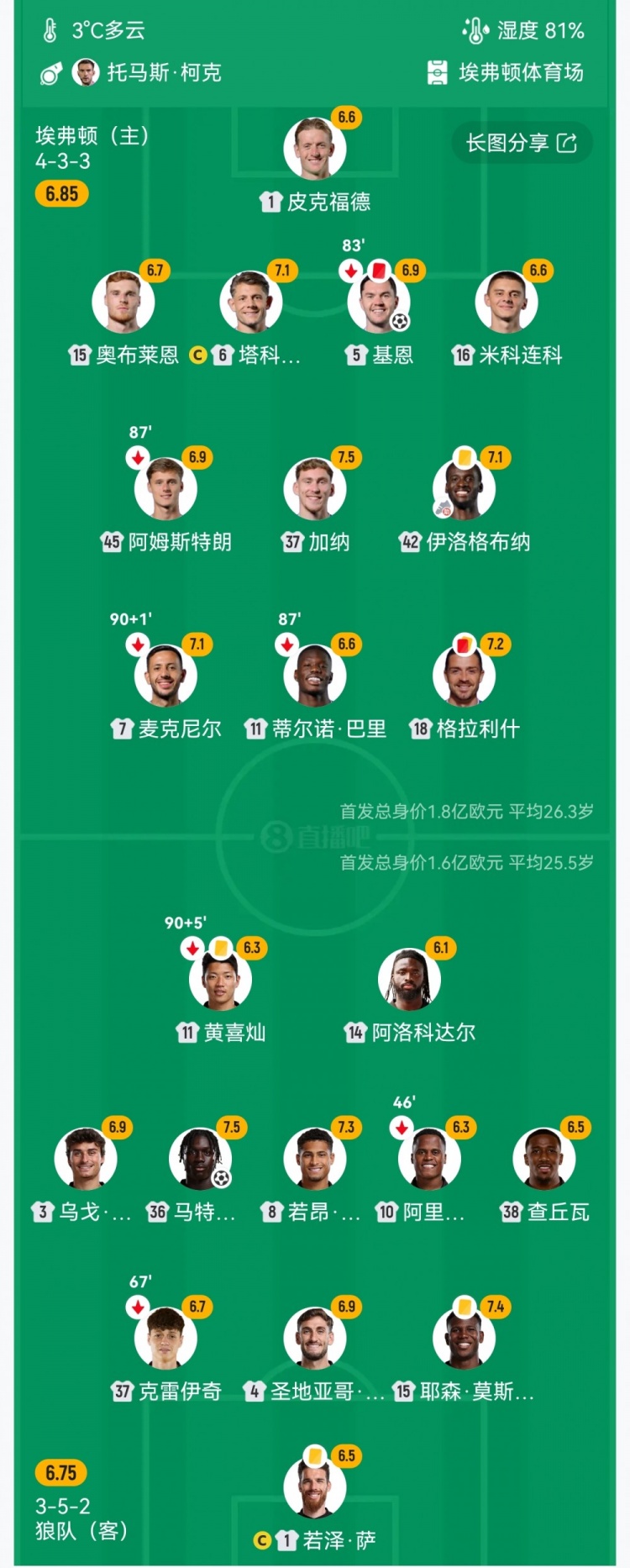 下半场补时9分钟。最终全场比赛结束,埃弗顿1-1狼队。