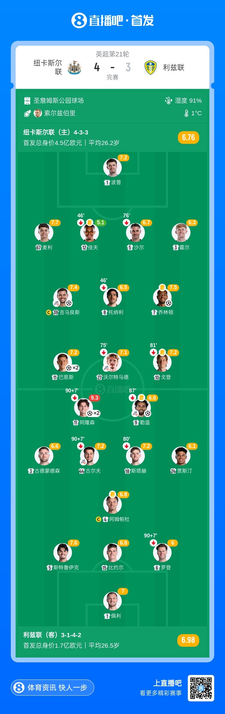 直播吧1月8日讯 北京时间4:15,英超第21轮纽卡斯尔联vs利兹联,比赛在圣詹姆斯公园球场打响!上半场,勒温助攻阿隆森先下一城,沃尔特马德助攻巴恩斯迅速扳平!半场补时阶段,佳夫手球送点,勒温点射破门。下半场,吉马良斯助攻乔林顿再次扳平!沙尔、贾斯汀相继中框!阿隆森梅开二度!补时阶段,阿隆森手球送点,吉马良斯点射扳平比分!读秒时刻,巴恩斯绝杀完成梅开二度!最终,纽卡4-3利兹联,英超取得3连胜!