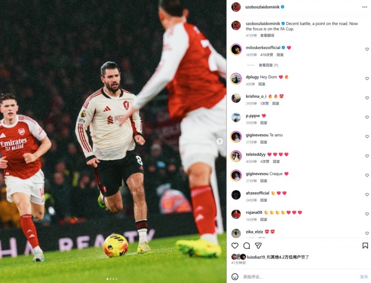 >索博斯洛伊社媒晒照:一场不错的战斗,客场对枪手拿到一分