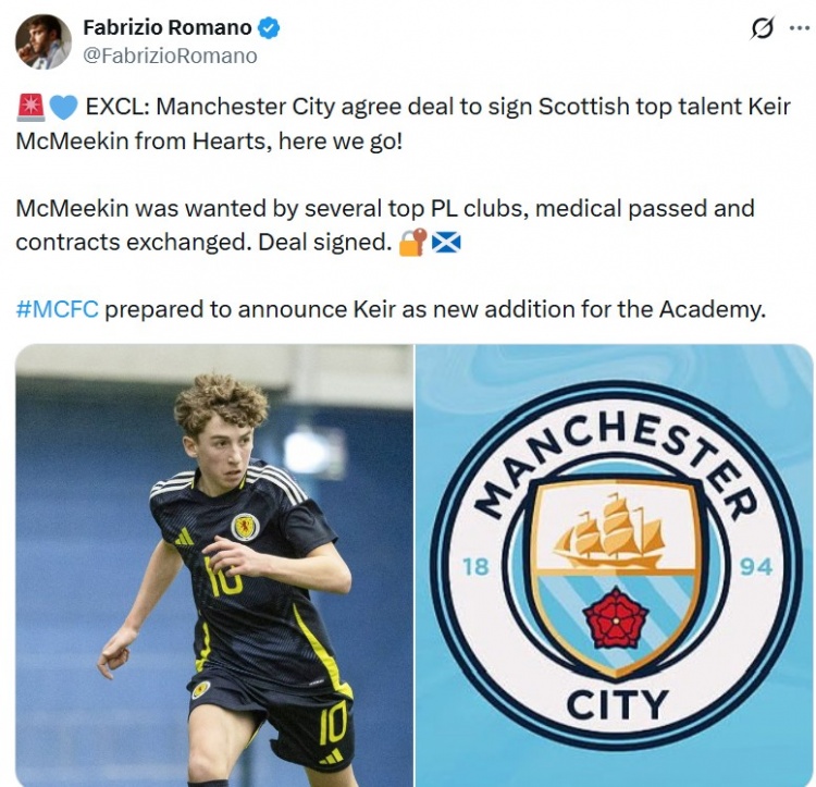 直播吧1月9日讯 据知名转会记者罗马诺报道,曼城即将从哈茨签下苏格兰天才球员基尔·麦克米金,Here we go。