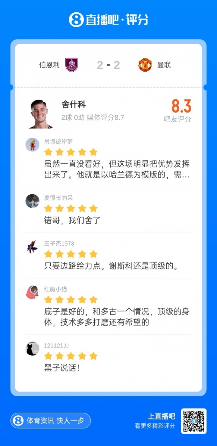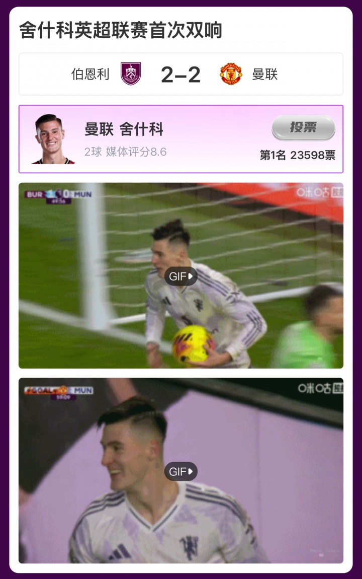 在曼联2-2伯恩利的比赛中,舍什科独中两元,首次在英超联赛上演梅开二度!舍什科获得吧友2.3万票,当选【直播吧X咪咕体育英超第21轮最佳球员】!