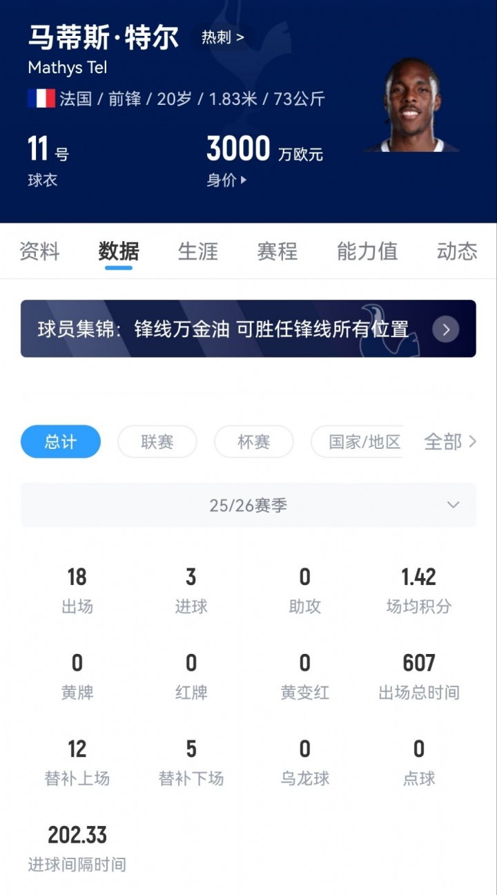 特尔在上赛季冬窗从拜仁租借至热刺,去年夏窗被买断,热刺总花费4500万欧。