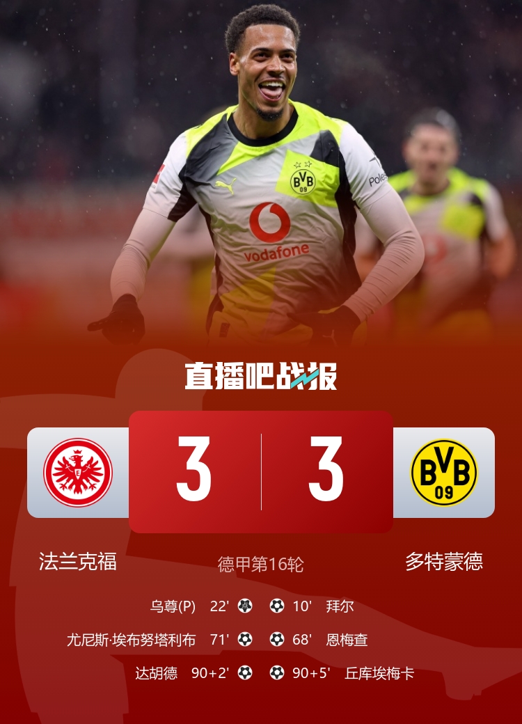 直播吧1月10日讯 德甲第16轮,法兰克福坐镇主场德意志银行公园球场迎战多特蒙德。上半场,拜尔先拔头筹,乌尊点射扳平。易边再战,恩梅查建功,埃布努塔利布单刀再扳平,达胡德92分钟进球,库埃梅卡95分钟绝平。最终法兰克福3-3多特。积分榜方面,多特33分先赛落后榜首拜仁8分,法兰克福26分第七。