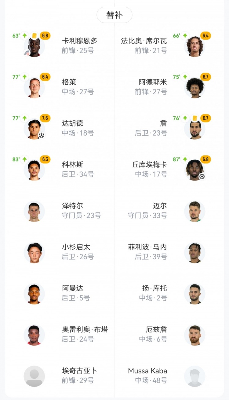 【双方首发及换人信息】