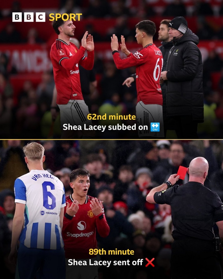 直播吧1月12日讯 足总杯第3轮,曼联以1-2不敌布莱顿惨遭淘汰。本场比赛,曼联小将莱西两黄变一红被罚下。