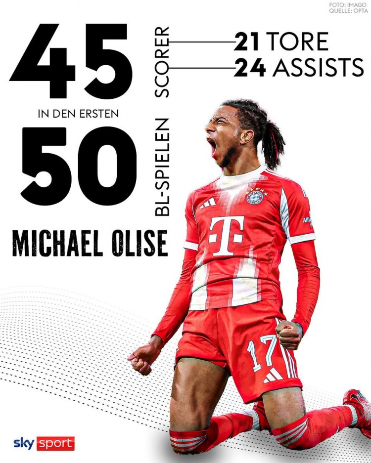 数据统计显示,奥利塞德甲生涯前50场直接参与45球(21球24助攻)。