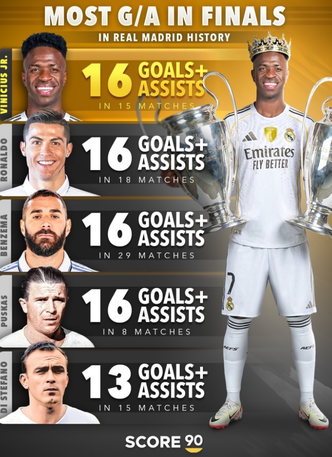 以下为皇马队史决赛参与进球榜(进球+助攻):